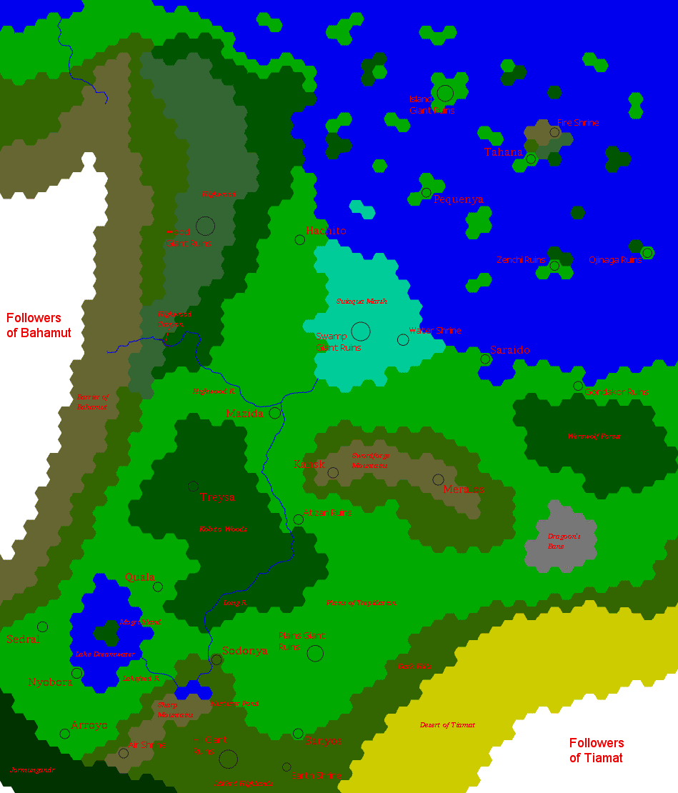Ruins and Dungeons:Air Shrine: This lies almost at the top of Songcry Mountain, one of the tallest ones in the Sharp range. Atizan: Once, this was the northern kingdom's answer to Quala. However, it too was attacked shortly before Quala was, only this time it was the southern kingdom that was framed. Unlike Quala, though, Atizan was never rebuilt. There were fewer survivors, and those scattered to different places, mainly Mazida and Quala but also including Treysa, Meralos, Saraido, Sodonya, and even Kansk. Earth Shrine: This sits nestled in the hills shortly beyond the current extent of Banyos's various mines. Fire Shrine: This sits right next to the volcano of Tahana. Giant Ruins (various): These are a mystery to archaeologists. These places are home to very large buildings with a strange script on them, so people can only guess that they were home to some kinds of giants. Gondakor: This was a small town that seems to have been abandoned about 2500 years ago. It features a port and was apparently only a temporary settlement, as the place has a sign marked, "Last one out snuff out the lamps". Ojinaga: Once, Ojinaga was the central home of the Dragon Knights, the forefathers of the modern Dragoons. However, near the end of the war between Tiamat and Bahamut roughly 3000 years ago, Ojinaga was brought entirely to the ground by Tiamat's followers. Water Shrine: This sits in the middle of a clearer part of the Suiaqua Marsh. Zenchi: This was the center of learning in Bahamut's time and presumably before, as it once was home to the Zenchi Library, the central gathering point for all human knowledge. Unfortunately, it was attacked near the end of Bahamut's Time, shortly before Ojinaga, and incredible amounts of knowledge was lost. Other Locales:Barrier of Bahamut: These are mountains so tall that the most skilled climbers have trouble with them -- not because they're incredibly steep, even if they are that also, but because the air gets too thin to breathe before one can reach the top. Legend has it that Bahamut himself conjured the mountains for the good dragons to hide behind so that they could live in peace. Dark Hills: These lead up from the Plains of Trepidation to the Desert of Tiamat. Arguably more dangerous than either, as behemoths are found here sometimes. Desert of Tiamat: So named because it's said that the dragon clans who used to follow Tiamat live out there. It's never been confirmed, as those explorers who go too far either never return or are never the same and don't report their findings. The dragoons have been known to discourage people from trying. Dragoon's Bane: The lowest point in the known world. The air pressure here is high enough to make flying and jumping a lot of trouble, not to mention rendering the place a kind of scarred, pebbled desert. Highwood: So called because this forest sits atop and astride the hils and highlands leading up to the Barrier of Bahamut. Highwood Canyon: A part of the Highwood River that features high stone walls, rapids, and Highwood Waterfall. Highwood River: Obviously called such because it passes through Highwood. It flows rapidly and is favored by kayakers. Jormungandr: The Serpent itself. It's said that Jormungandr shields the world from darkness or demons or nothingness, depending on who's asked. Worshippers of Jormungandr also maintained that he created this world for mortals, that he's providing them a second chance. Kobito Woods: This place is best known as the home of the elves. It also acts as a neutral zone between the North and the South because of this. Lake Dreamwater: A freshwater late, popular for boating and fishing in. However, swimming is discouraged as it's said that sahuagin live in the depths... Lakefeed River: A short river leading from the Sharp Mountains to Lake Dreamwater. Long River: The longest river known to man, stretching all the way from the Sharp Mountains to Suiaqua Marsh. Mithril Highlands: A collection of large hills and occasional small mountains, so called because of (duh) the mithril deposits to be found. Known to be home to ogres. Mogri Island: Some say that there are white things of some sort living here. Others fail to meet any and claim it's all a hoax. Nurturer Pond: A tiny lake so called because it's the ultimate source of two of the biggest sources of water around. Placid aside from the waterfalls leading out. Plains of Trepidation: Dangerous monsters inhabit this area, including spelleaters, bombs, zu, cockatrices, adamanti, gilders, lamias, and more. Generally avoided if possible, but it's also necessary for some to visit here sometimes to get rare reagents. Suiaqua Marsh: This is an immense saltwater marsh. Home to equally immense bugs and amphibians, though it's also said that Shiva can sometimes be found in the area... Swordforge Mountains: The more manageable range of mountains around. So called because it's through these mountains that you can reach the dwarves, who are said to have invented metalsmithing to begin with. Werewolf Forest: If werewolves ever really existed, then this is where they were most commonly found before they went extinct, by all accounts. Whether it's true or not, it's certainly a creepy, spooky forest. |